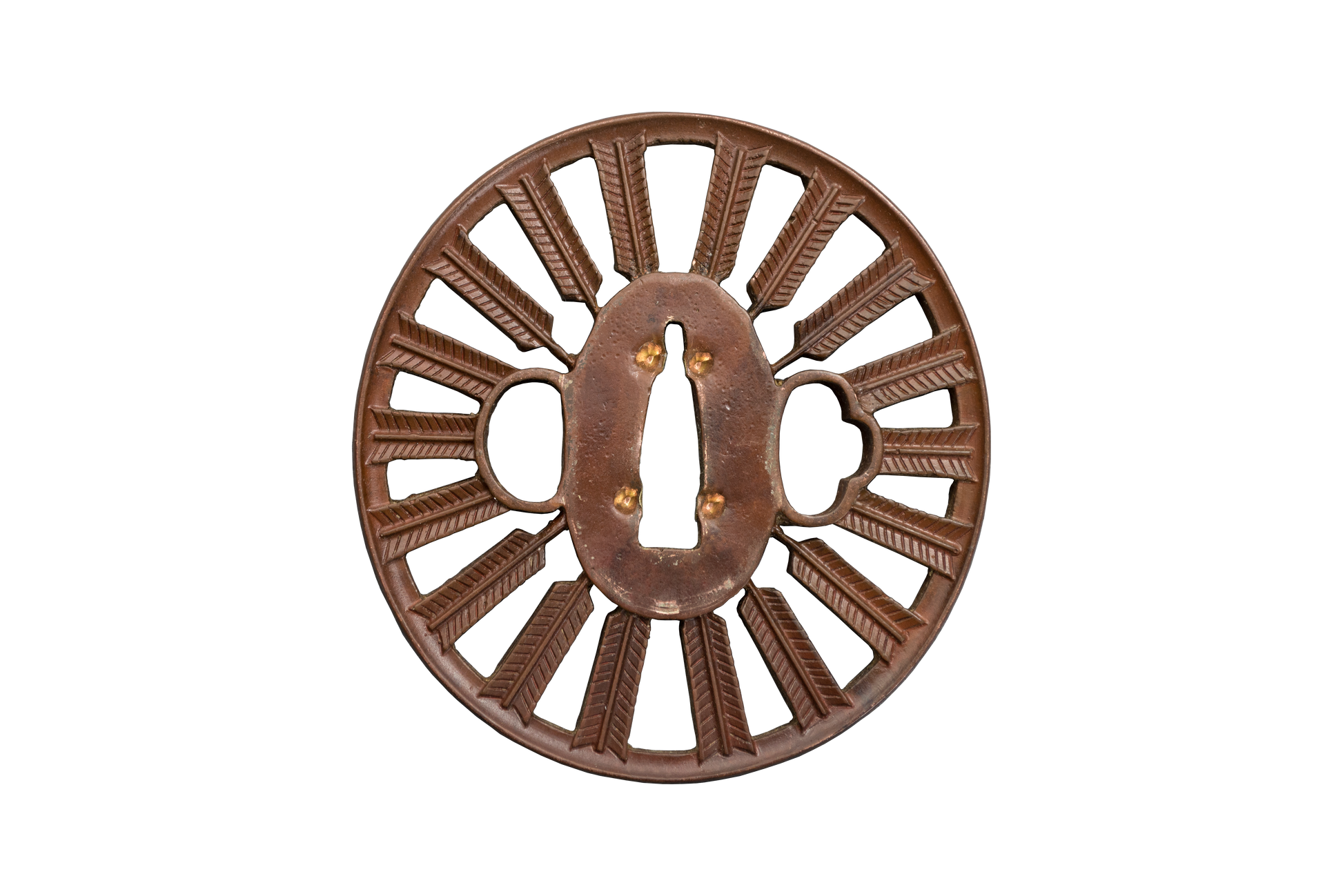 Most Westerners consider the katana to be the symbol of the samurai, their oldest martial tradition is in fact, archery. The fletching motif on the tsuba of this katana reflects the martial tradition of the samurai. Forged carbon steel blade with a real hamon and genuine same ray skin, textured brown saya, coupled with the copper tone furniture, and silver arrowhead manuke, seppa, and habaki complete the look of this katana.