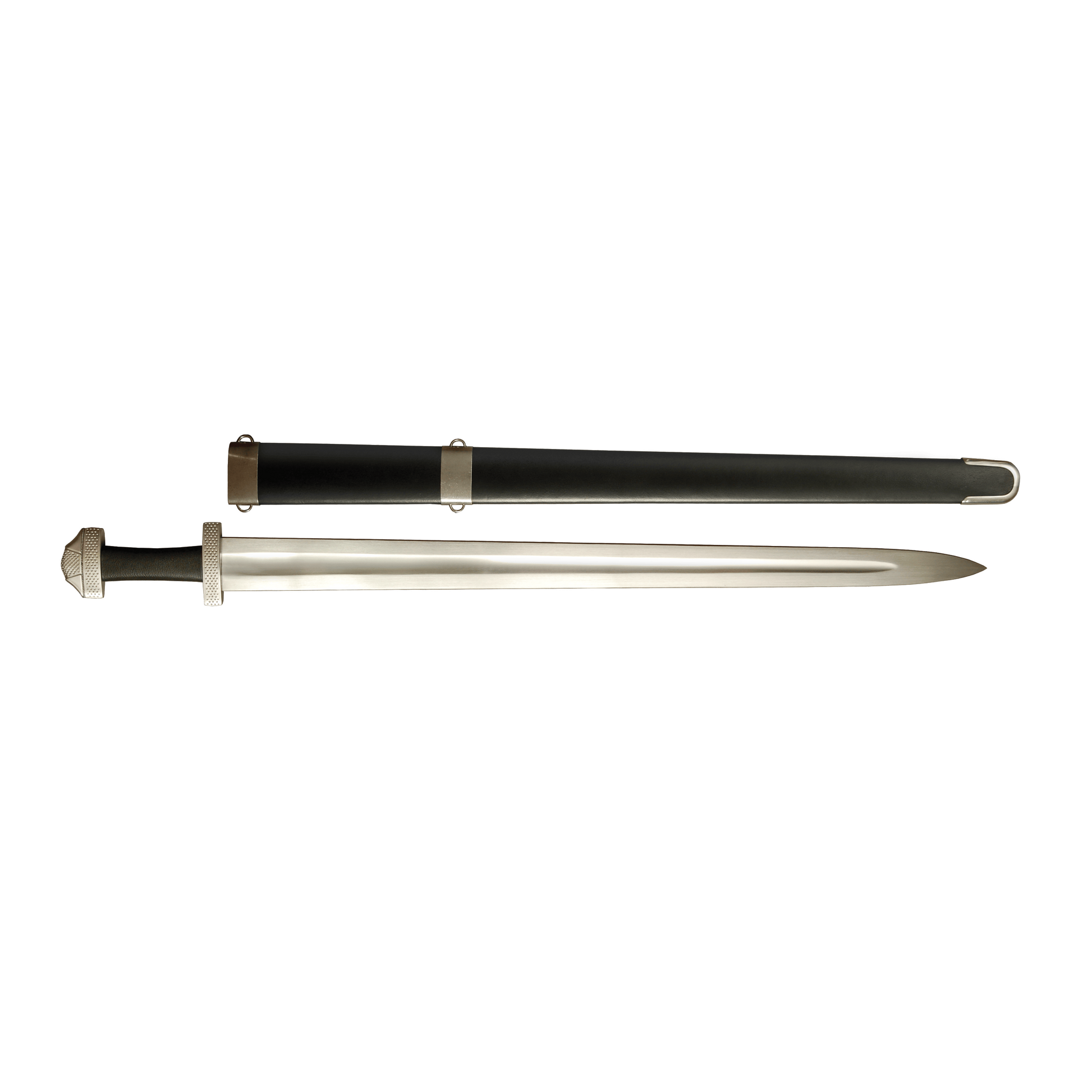 Based on several historical examples found around the Trondheim area in Norway, where circular indentation hilt decoration was popular. The high carbon steel blade and tang-riveted hilt provide a period piece ready to satisfy to most stringent of reenactors. The scabbard design includes suspension points and a period chape. From the Tinker Pearce series of swords by Paul Chen Hanwei.